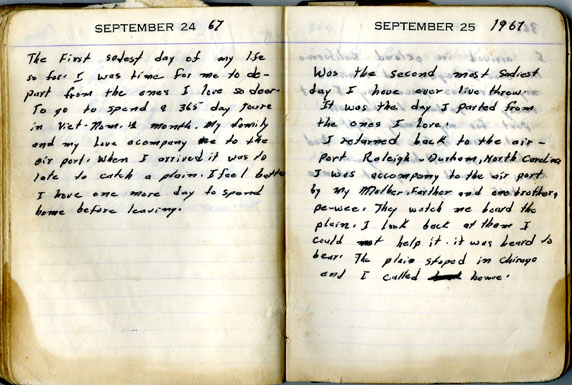 The only thing that mattered to him was that he loved his girlfriend, Miss Katie Mae Butler - of that he was certain. The only other thing left to do before leaving home was to paint a portrait of himself on the front pages of his diary. Just in case this was all that was left, at least someone would know his name, his features, his body measurements, his home, his rank, his squadron, his division - his girlfriend. As a short-timer, infantryman, he knew that he had 365 days to serve before returning home. Though determined, my Daddy was doubtful if he would make it back home alive, and he began his diary, not at the beginning of the book, but on the day that he departed, September 24, 1967.